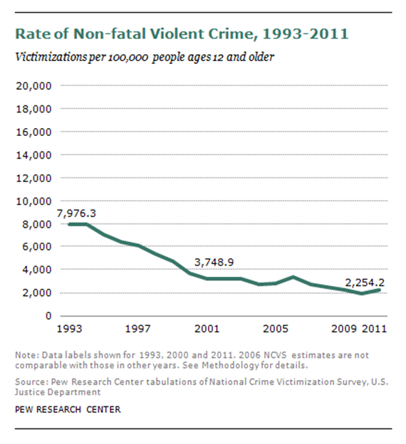 - Drake, B, “Rate of non-fatal violent crime falls since the 1990s”, Pew Research Centre, June 14, 2013: https://www.pewresearch.org/short-reads/2013/06/14/rate-of-non-fatal-violent-crime-falls-since-the-1990s/ ↩︎